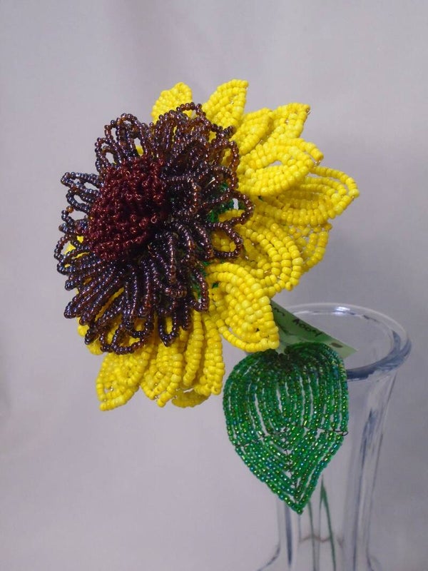 French beaded sunflower, single stem, 2 leaves, glass vase, tan glass beads). 13.5x6x5", flow 4.5x4x1.5", leav 2.5x2"
