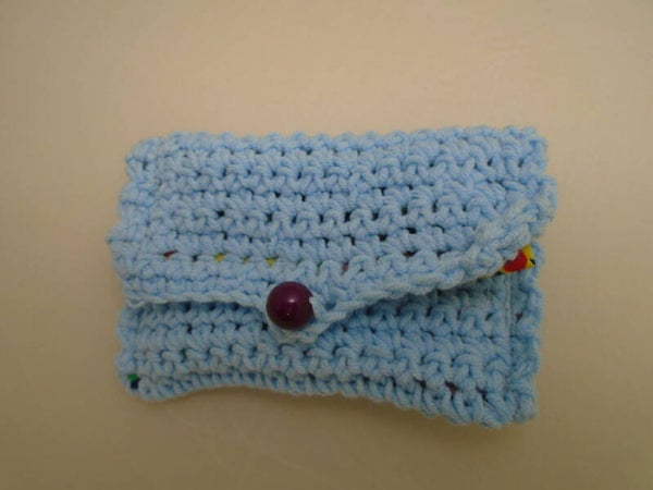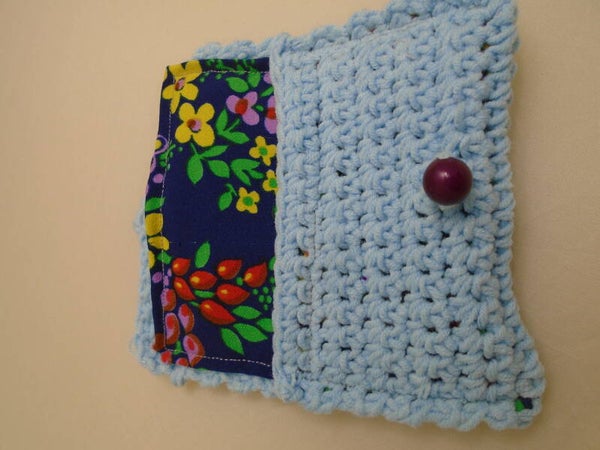 Crocheted pouch, lite blue w/ floral fabric inside, maroon plastic bead. 4" x 3". 100% cotten/acrylic blend