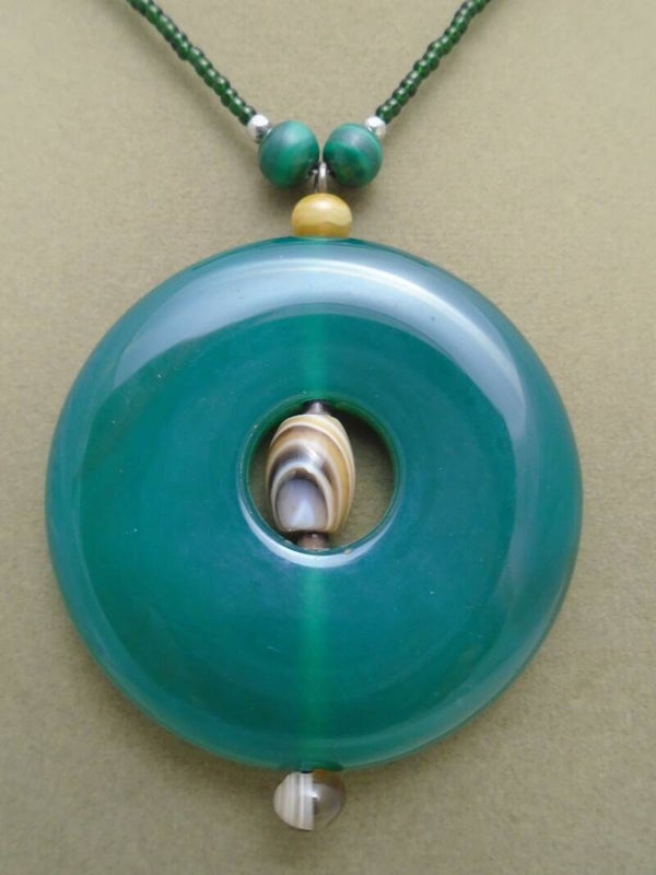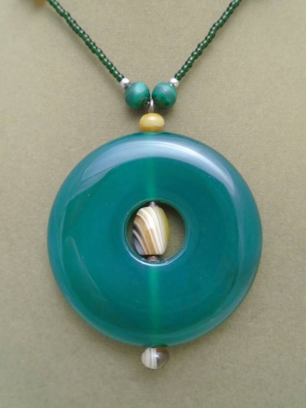 Green agate donut necklace with agate center & Botswana agate ends. Bead strand includes malachite, Botswana agate & sterling silver beads. strand 16" around, pendant length 2.75", pendant width 2.1"