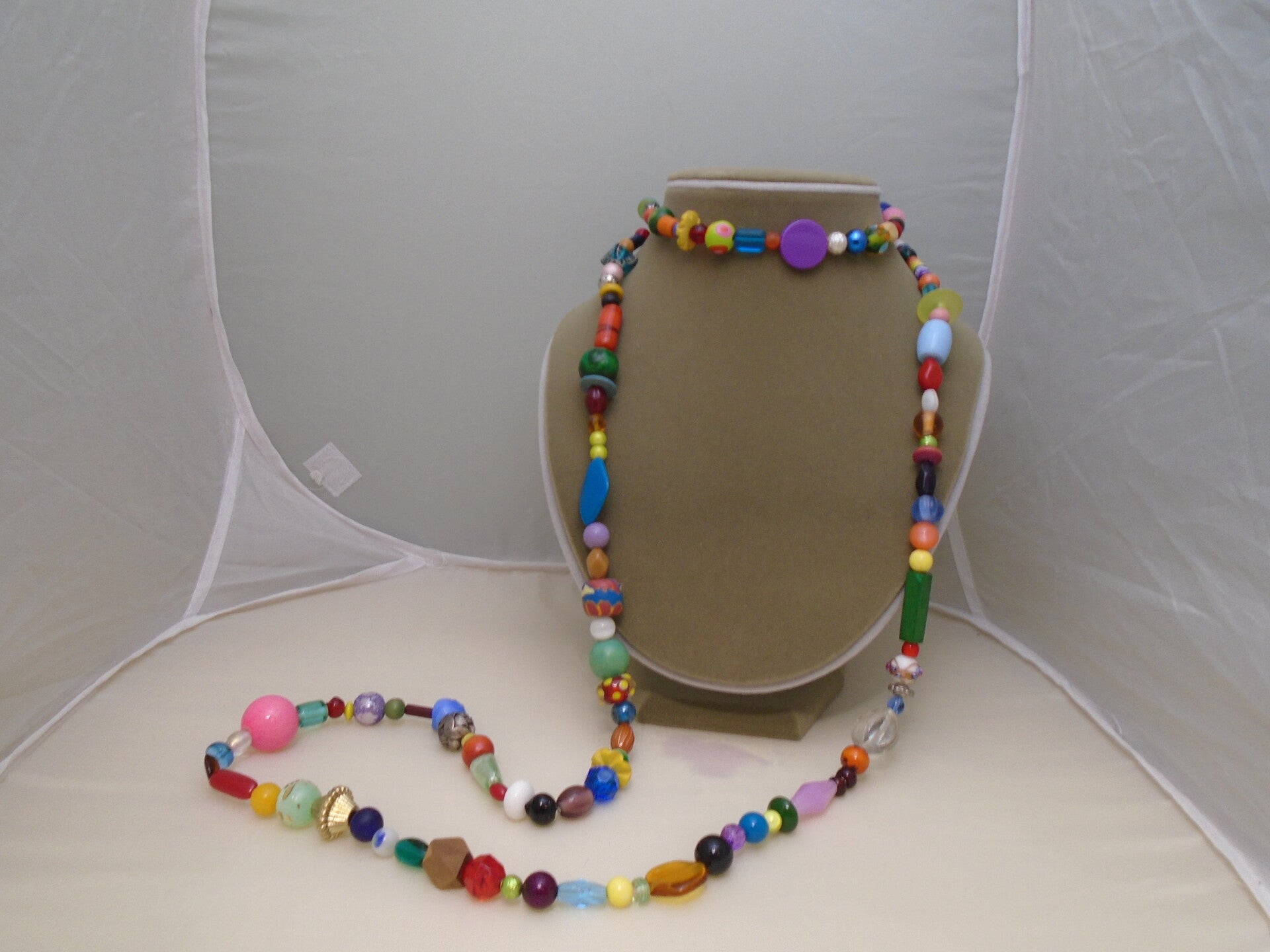 Made with miscellaneous glass, plastic, wood & clay beads, with a clasp for extra wrap around potential. strand 57.25" around