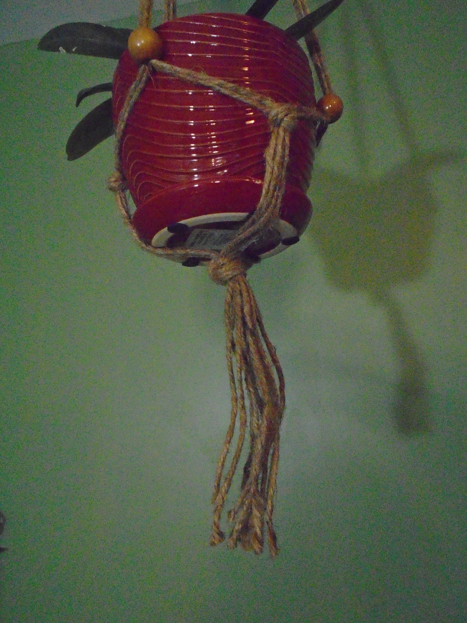 Jute plant hanger, suitable for small to medium pot. Green & tan wood beads. Plant not included. 44" long without plant