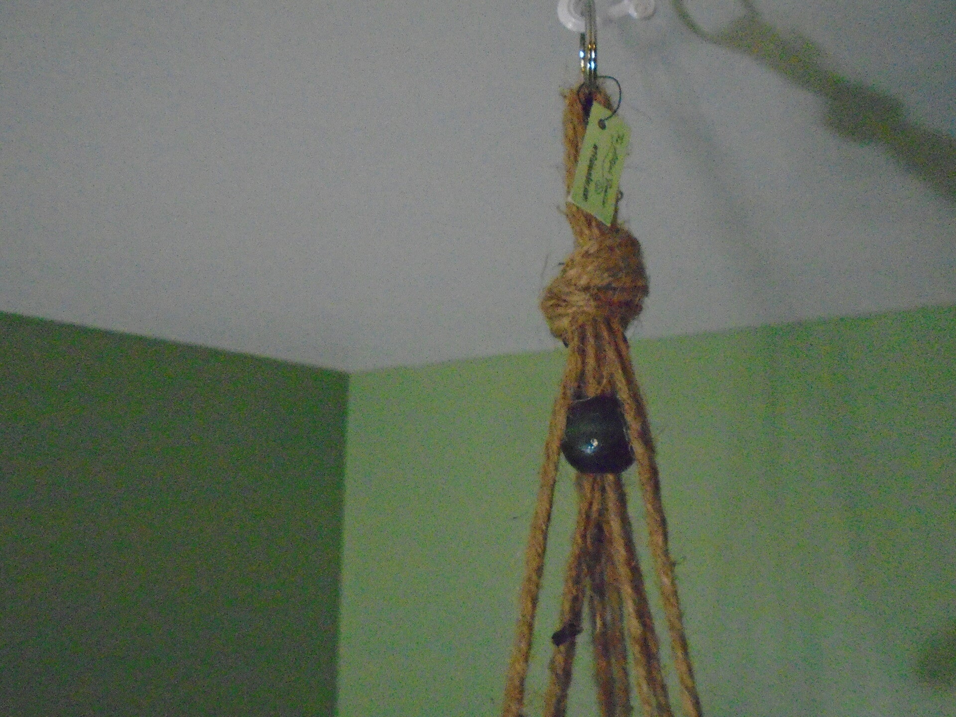 Jute plant hanger, suitable for small pot. Beads include green wood & black wood with rhinestones. Plant not included. 33" long without plant