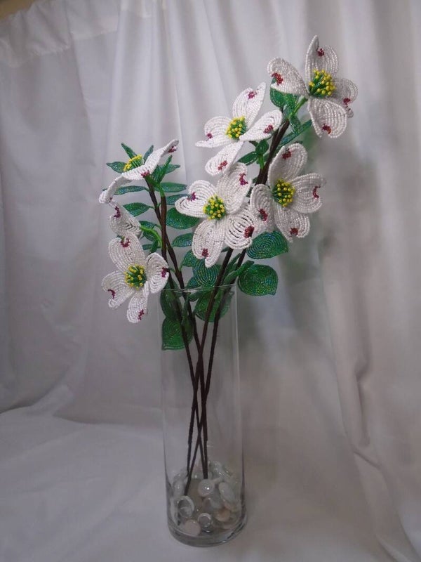 French beaded flowering dogwood arrangement, 4 stems: 2 flower stems, 2 leaf stems. Glass seed beads, glass vase, glass filler beads. 21"h x 11"w x 9"d