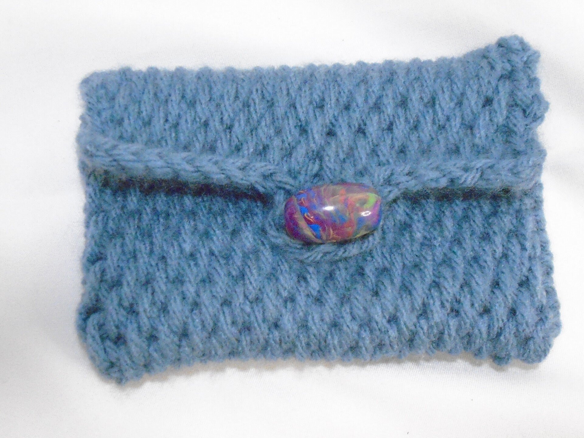 Tunisian crocheted blue wallet-sized pouch, swirly plastic bead. 100% acrylic. 4.75 x 3.25 x 1.25".
